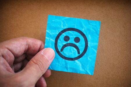 Man holding blue paper note with sad face on it in his hand. Closeup.