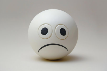 White card displaying a simple, hand-drawn sad face stands vertically against a neutral gray backdrop, conveying feelings of unhappiness, disappointment, or negativity