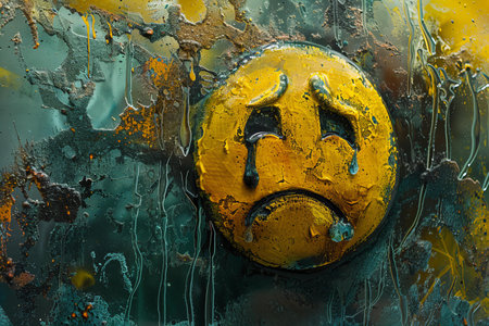 A sad face is sitting on a wet surface. The water droplets on the surface reflect the face, making it appear even more melancholic