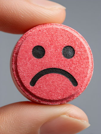 A closeup of a red pill featuring a sad face icon, representing negative emotions, depression, or adverse medication effects.