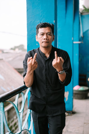 A man shows his fingers with an upset expression against a blue wall on a balcony.