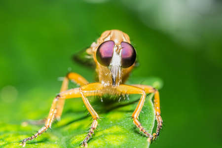 close up to robber flies or assassin fly waiting in ambush for its prey on grean background