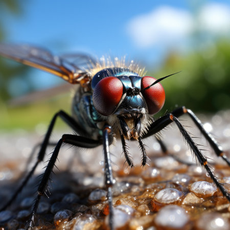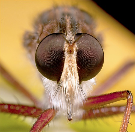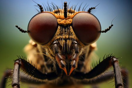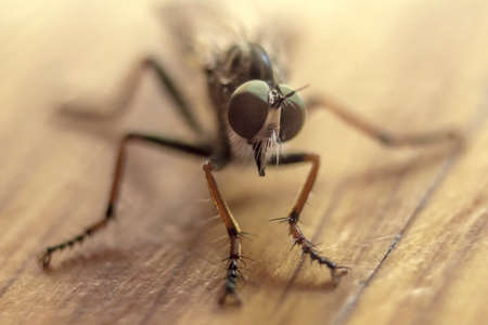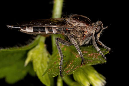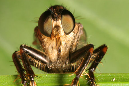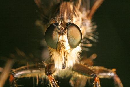 Ultra-macro shot of a robber fly, showcasing its intricate features and predatory demeanor.