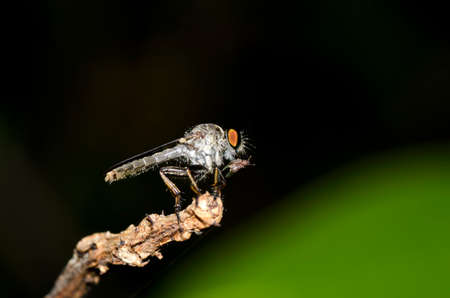 Close up a robber fly on branch and dark background, Nature background, Big eye insect, Thailand.