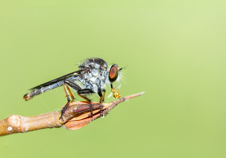 Robber flies (Insecta : Diptera , Asilidae , A predator fly standing on a branch, sucking liquid from its prey against a light green background.