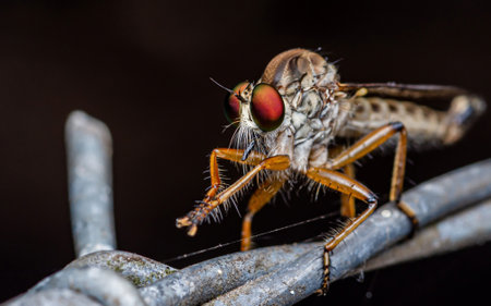 Robber fly on a barbed wire with black background, Select focus of head and eye detail, Insect photo.