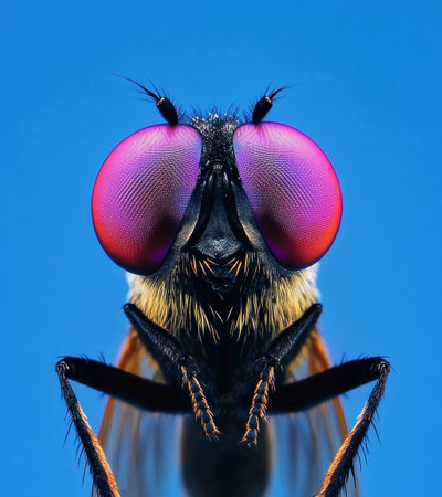 Close up portrait of a fly with iridescent pink and purple eyes against a bright blue background, highlighting intricate details and vibrant colors for nature enthusiasts
