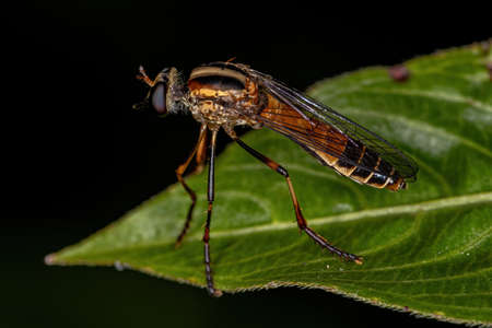 Detailed lateral cCloseup on a robberfly, Tolmerus cingulatus , in the garden