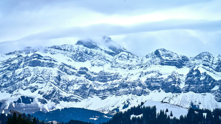 Snow-covered mountain range under cloudy sky during winter in the Alps region