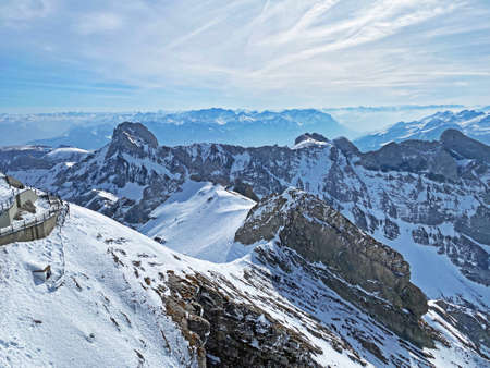 View of the snowy alpine peaks from Säntis, the highest peak of the Alpstein mountain range in the Swiss Alps - Canton of Appenzell Innerrhoden, Switzerland (Schweiz)