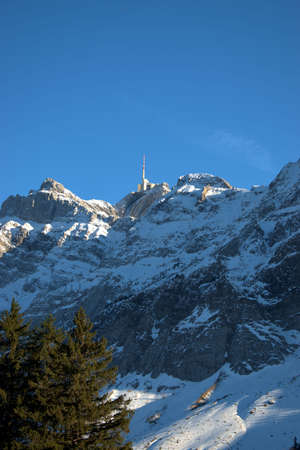 Snow-capped alpine peak Säntis (Saentis or Santis, 2502 m) in Alpstein mountain range and in Appenzell Alps massif, Unterwasser - Canton of St. Gallen, Switzerland / Schweiz