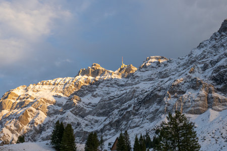 dramatic view of the santis in alpstein appenzell. The summit shines in the last rays of the sun. Snow in the Alps