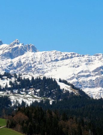 View from a snow coveread meadow to Saentis, a mountain in Switzerland