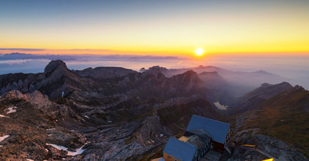 sunset on top of the swiss mountain hoher kasten in appenzell switzerland with clouds, beautiful mountain lake and forest