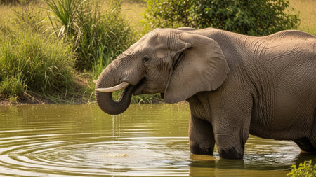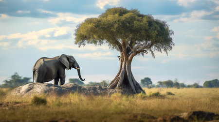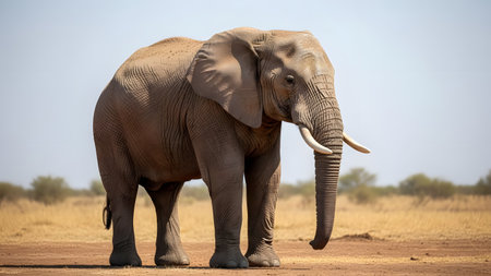 A close-up view of a majestic African elephant standing gracefully in its natural habitat. The scene captures the beauty and tranquility of wildlife in the wild.