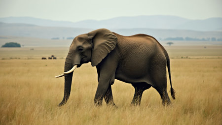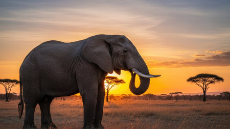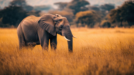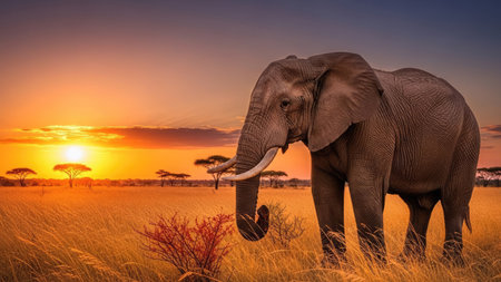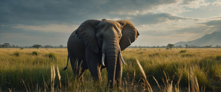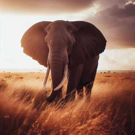 Majestic elephant walking through tall grass on the savanna during a golden sunset, creating a dramatic and evocative scene