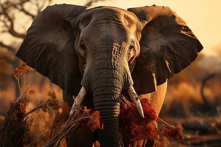Close up view of an elephants head and tusks, bathed in the warm glow of the setting sun, set against a softly blurred backdrop of golden savanna grasslands