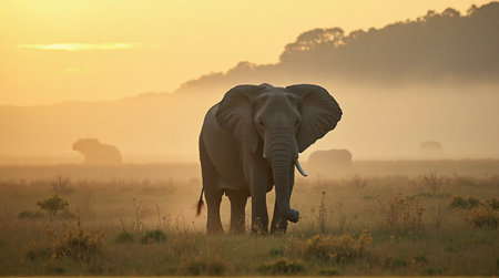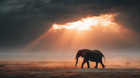 This captivating image showcases a majestic elephant emerging through misty landscapes, embodying the beauty of wildlife and nature's tranquility.