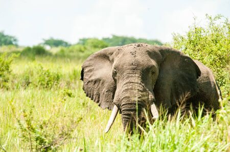 Large African elephant with its tusks. Afrikanischer Elefant / African elephant / Loxodonta africana in its natural habitat