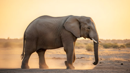 A majestic African elephant walks across the dry savannah, kicking up dust in the golden sunset light. The side profile captures the sheer size and power of the animal in its natural habitat.