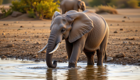 timeless elephant photographed in a drinking pose in a dry riverbed, in a classic wildlife photography style, with warm brown tones, golden hour light, high resolution