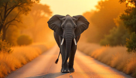 Powerful elephant walking majestically across golden African savanna at sunrise, creating a sense of awe