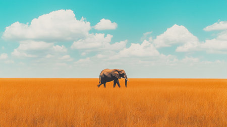 A majestic elephant walks through the vast golden grasslands, set against a clear blue sky with soft white clouds. The serene and minimalist scene captures the tranquility and grandeur of wildlife in its natural habitat