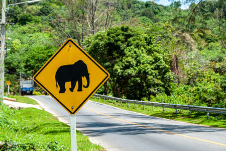 One road signs elephant crossing warning. Orange rhomboid icon road about elephants traffic. Beware of cattle. Warning that the animal can suddenly appear on the stretch of road in front of you.