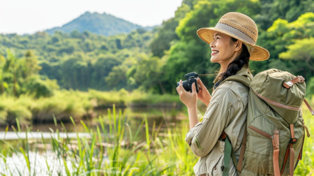 Tourist woman taking photos, exploring sights, blurred background, copy space for text.