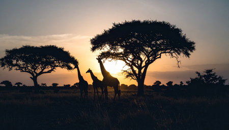 Acacia trees and grazing giraffes silhouetted against fiery sunset, golden savanna grasses, Amboseli backdrop.
