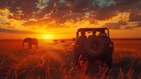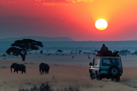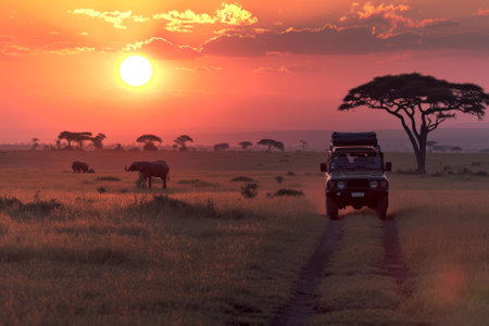 Breathtaking safari sunset scene capturing a tranquil savanna landscape with a herd of elephants silhouetted against the vibrant colorful sky An expedition vehicle traverses the rugged terrain