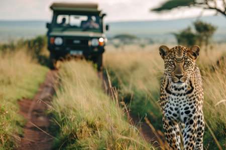 A leopard is walking gracefully down a dirt road next to a jeep on an African safari adventure. The leopards distinctive spots stand out against the dusty terrain as it confidently moves alongside the vehicle.