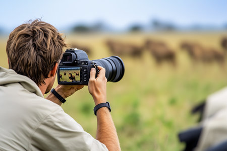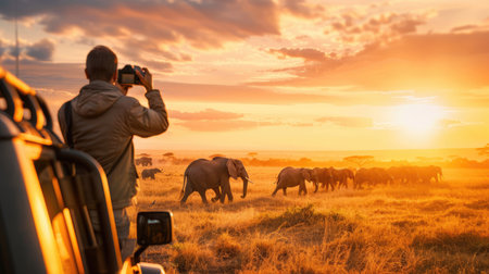 Man standing on a safari car, holding a camera with a telephoto lens, capturing a herd of elephants walking across the savannah at sunset, bucket list lifestyle concept