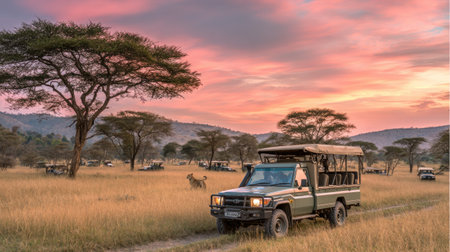 A safari vehicle travels through a grassy savanna at sunset, bathed in warm light. The image features a vehicle with passengers and a backdrop of acacia trees and hills. The sky displays vibrant shades of pink and orange. This scene suggests travel, tourism, and exploration, suitable for a range of uses.