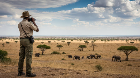 Safari adventure: male ranger observing elephants in african savanna landscape.