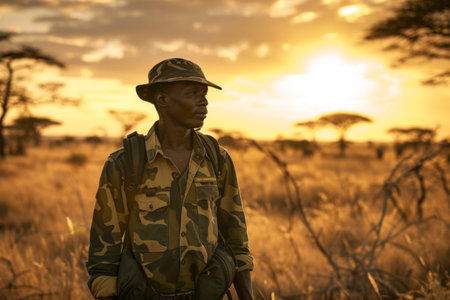African wildlife rangers on patrol in savanna protecting natural habitat