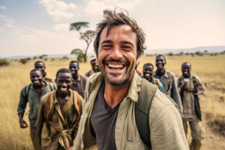 A stylish man smiles during a safari adventure, surrounded by wildlife, capturing the joy of exploring nature