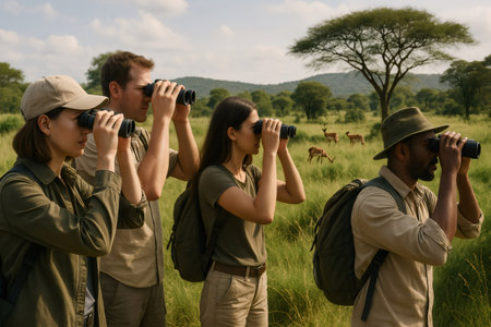 Group of eco tourists using binoculars to watch wildlife in a lush savanna landscape, with antelopes grazing and a scenic tree in the background