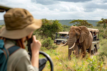 Tourists enjoying a safari experience, observing a herd of elephants from their jeep in the African savanna