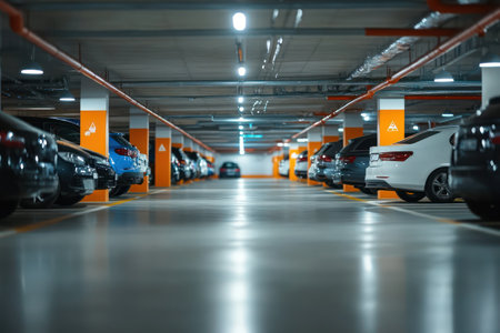 Spacious and modern empty parking garage featuring well-maintained vehicles and bright overhead lighting, designed for urban convenience and safety.