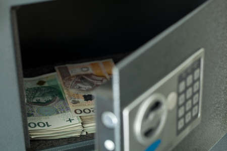 Open safe in a wealthy house. Safety box in hotel room. Concept safe storage of money and documents