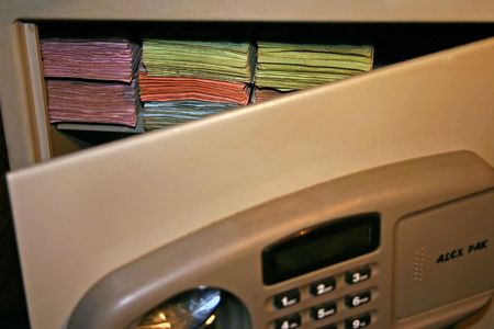 A closed bank safe with a hundred dollar bill sticking out from under the door.