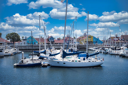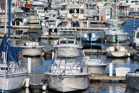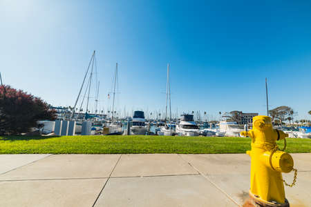 Boats moored at Embarcadero Marina Park North, San Diego. Boat, yachts, ship and sail docked at the harbor. Marina with anchored luxury boats. California. USA. January 16th, 2021
