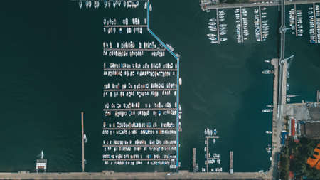 Aerial top view of boats and yachts in modern marina from above, Mediterranean sea, South France