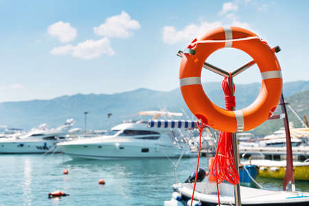 Lifebuoy in the marina for yachts. Red circle on the boat dock. Porto Montenegro, Montenegro.