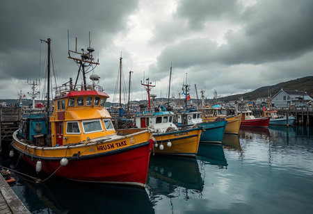 Vibrant fishing vessels rest peacefully in a serene harbor, their reflections shimmering in the water. Dark clouds loom above, adding a dramatic touch to the coastal setting.