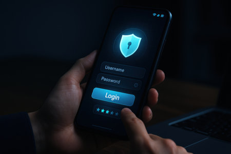 The image depicts a person using a smartphone to access a secure login interface. The screen shows a login page with a prominent padlock icon, indicating strong security measures. The user is in the process of entering their password to gain access.