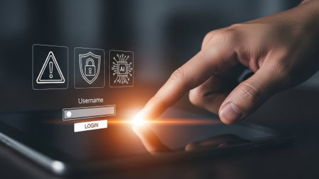 Close-up of a finger interacting with a digital interface displaying security icons and login fields.