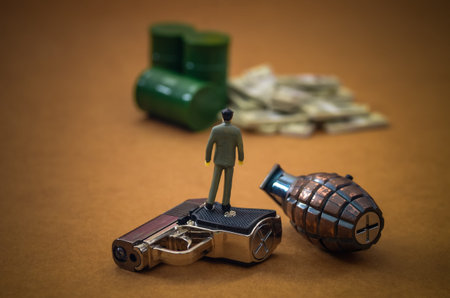 Miniature Figurine on Toy Gun with Grenade and Money Symbolizing Conflict, Power, and Economic Gain