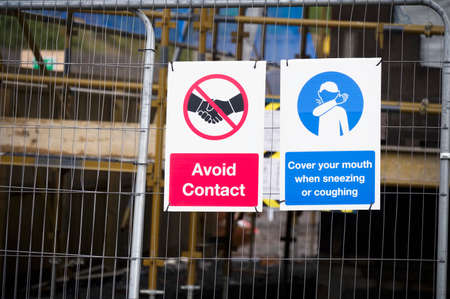 Caution sign in factory warning to industry labor worker to prevent Covid-19 Coronavirus spreading during job business reopening period after epidemic crisis . Working safely concept .